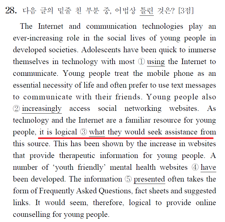 수능 및 평가원 모의고사의 영어 어법 관련 문제의 경우 영어 실력이 뛰어난 학생들은 대부분 어렵지 않게 답을 찾아낼 수 있다.